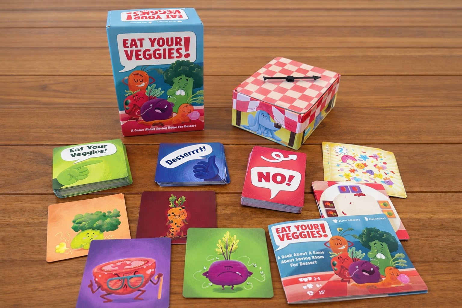 Eat Your Veggies! was playtested many (hundreds of) times, most of them with our 5 and 7 year old daughters. We didn’t stop improving the game until everyone always had fun.
