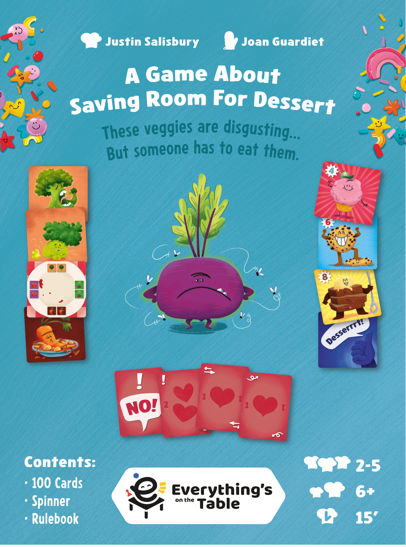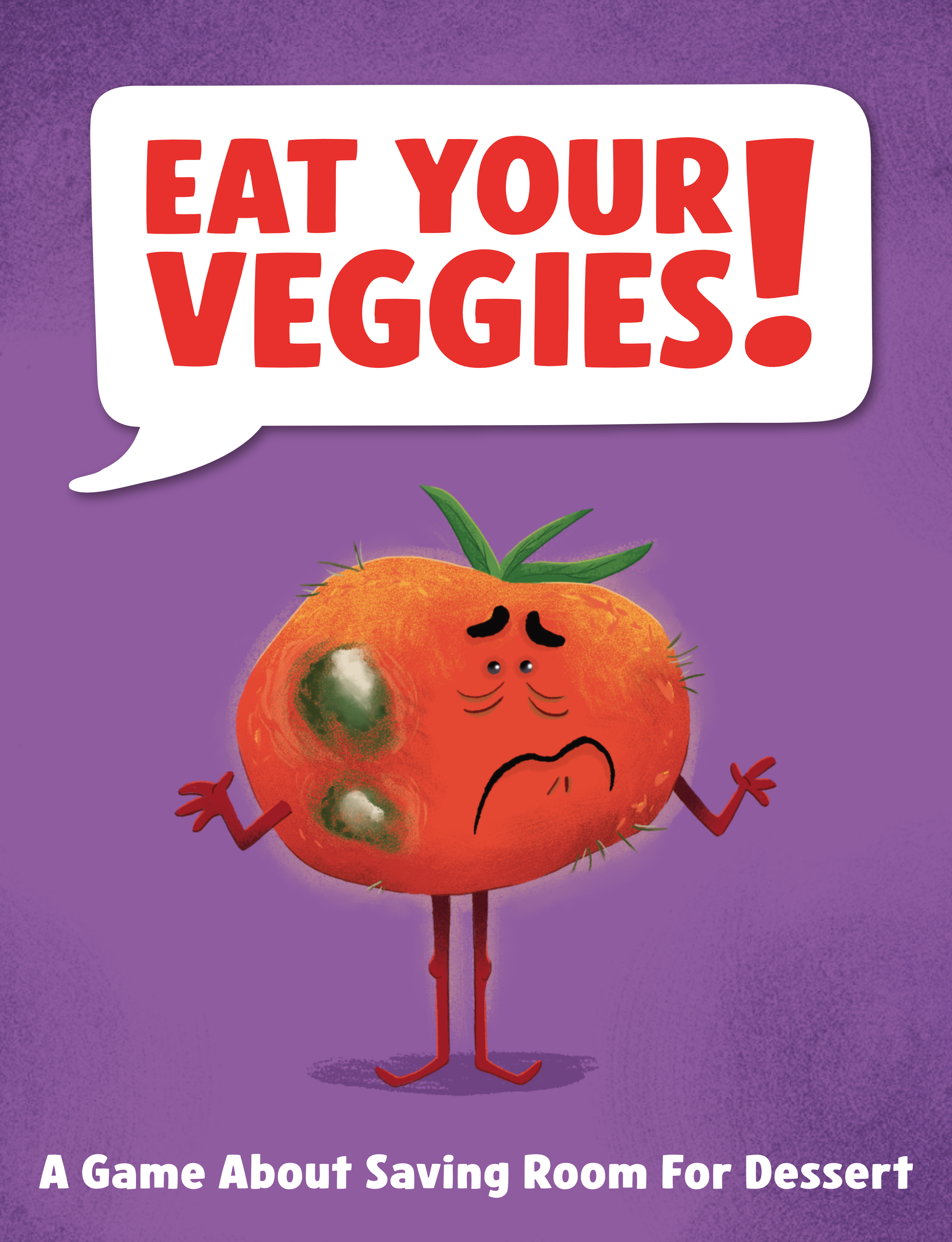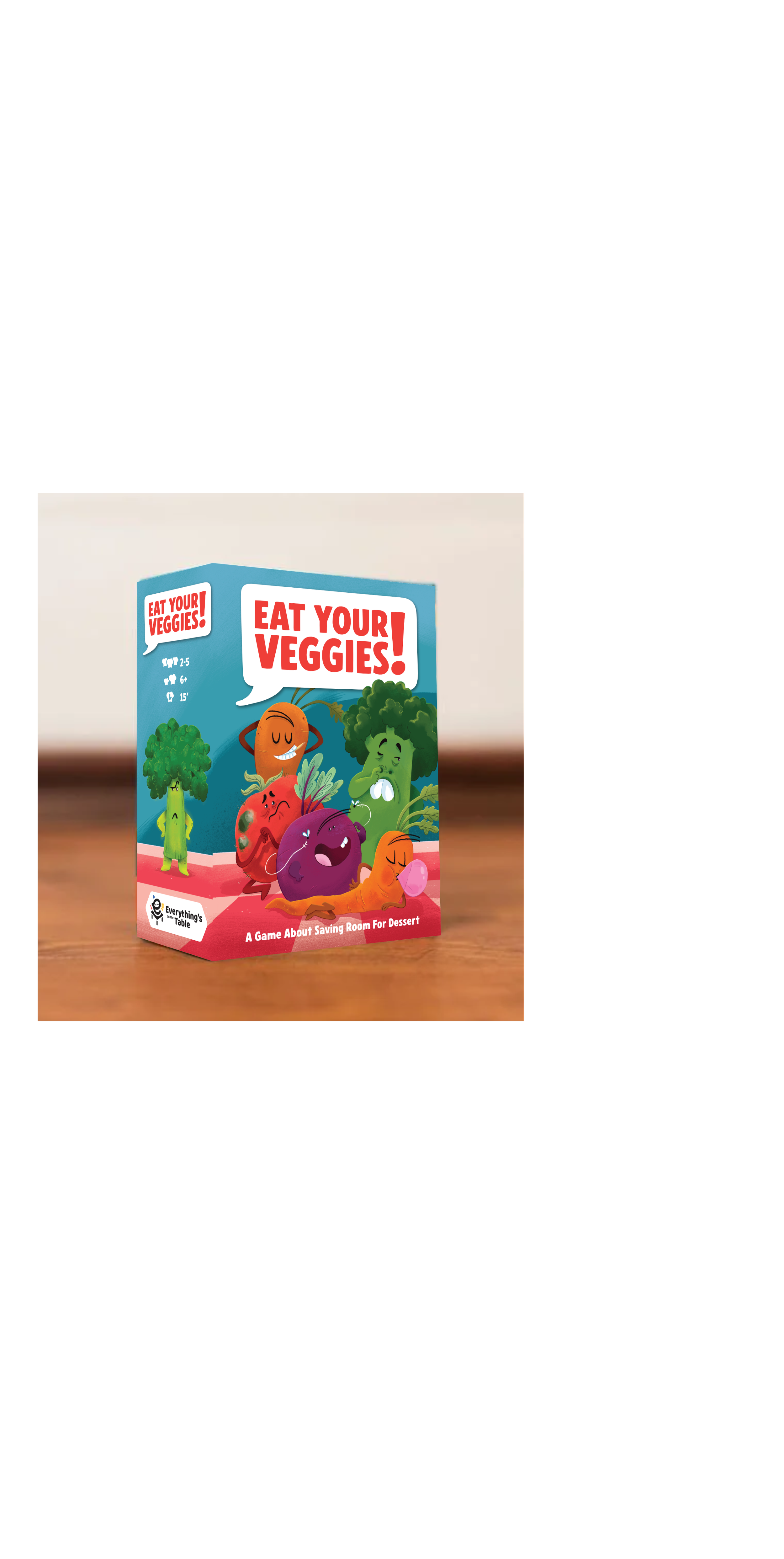 A fast paced card game where players pass, reverse, and skip their way around the table, refusing to eat veggies. As players refuse veggies, the pot of cards grows bigger and bigger, until eventually someone gives in and Eats Their Veggies! earning the entire pot of cards, but also filling their plate with veggies. When it’s time for dessert, you’ll need to have saved up enough cards to get the best choice, but you’ll also need room on your plate for dessert. May the pickiest eater win!